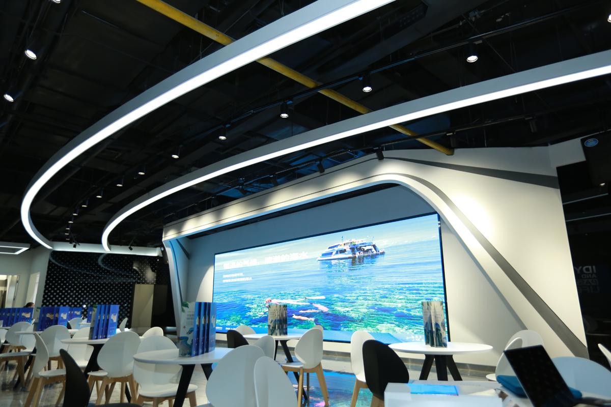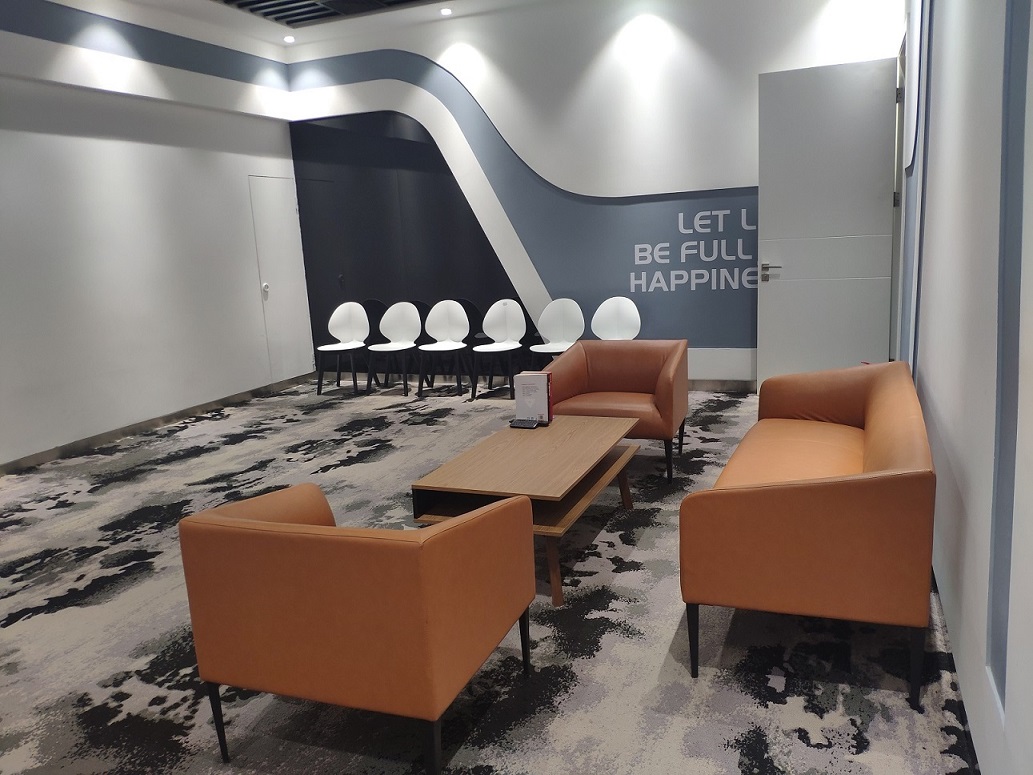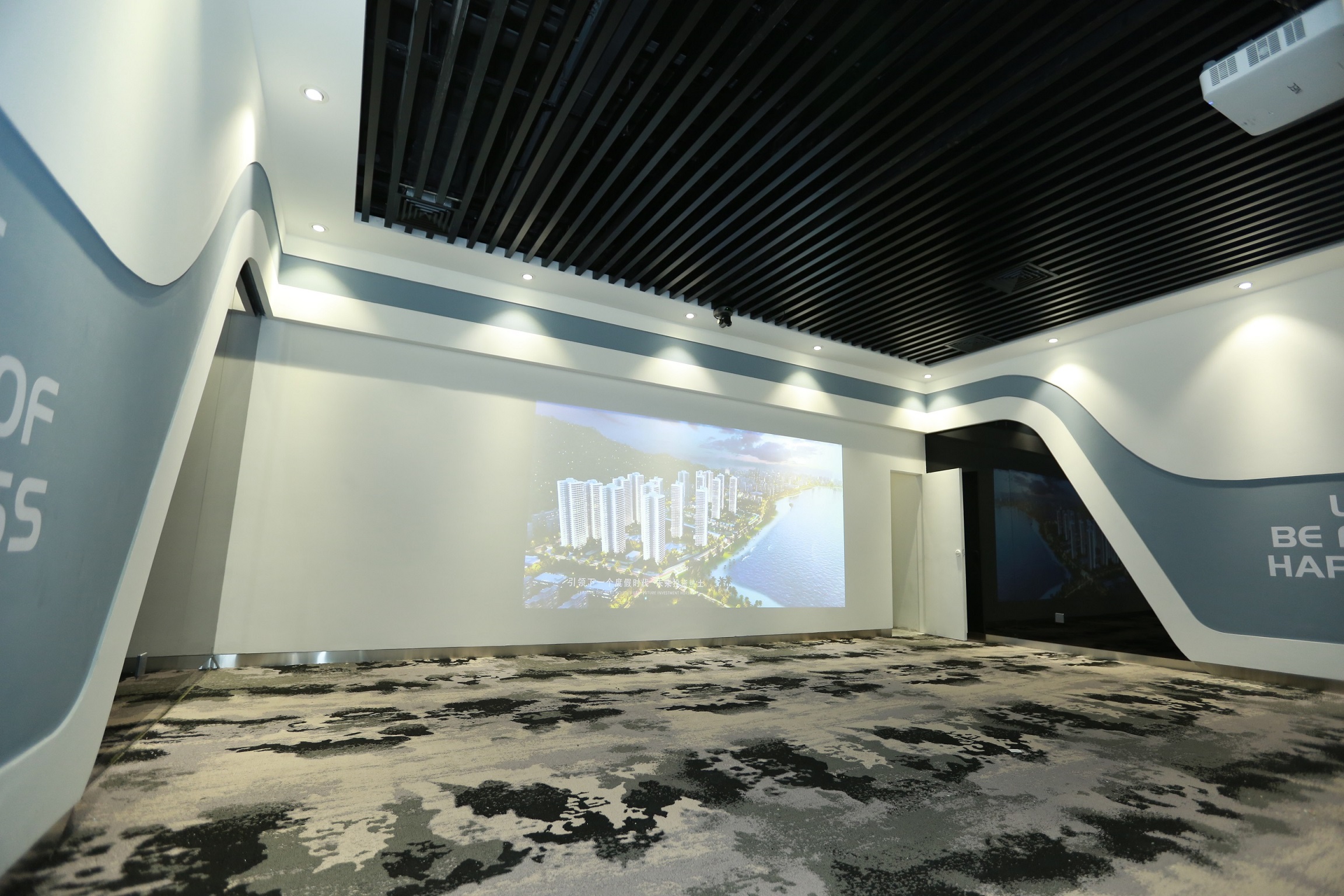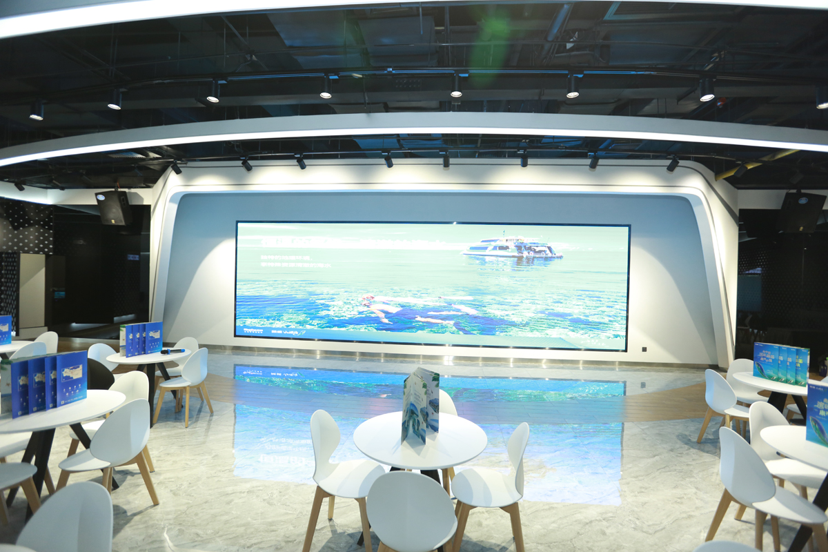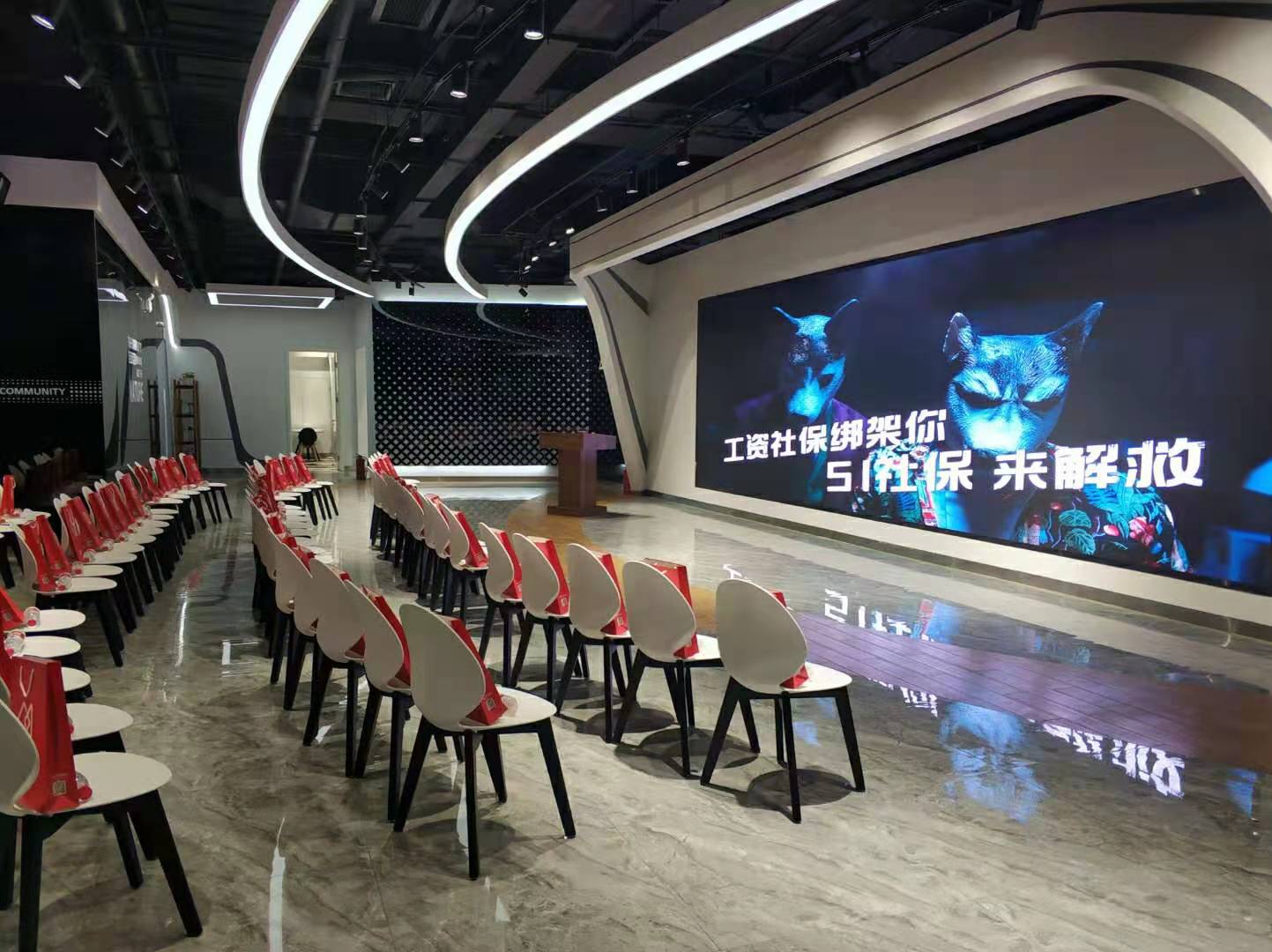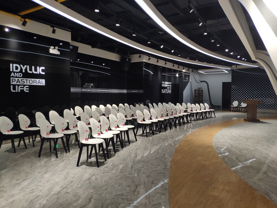 位于1楼,矩形会场,长8米,宽5米,灯下净高3.4米。无窗无柱,有投影。